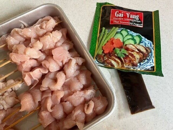 タイ風焼き鳥の素、と書いてあるので鶏胸肉を使って焼き鳥を作ってみました。