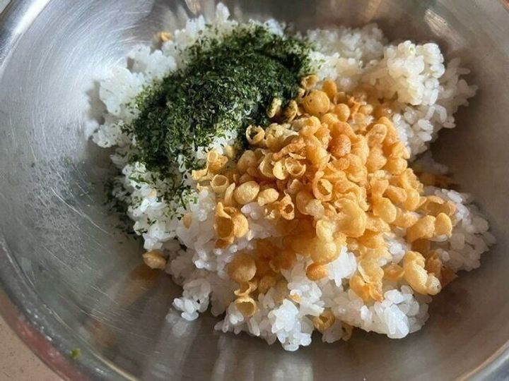 炊きたてのごはんに「あげ玉 ゆず胡椒味」を入れ、今回は青のりも入れてみました。