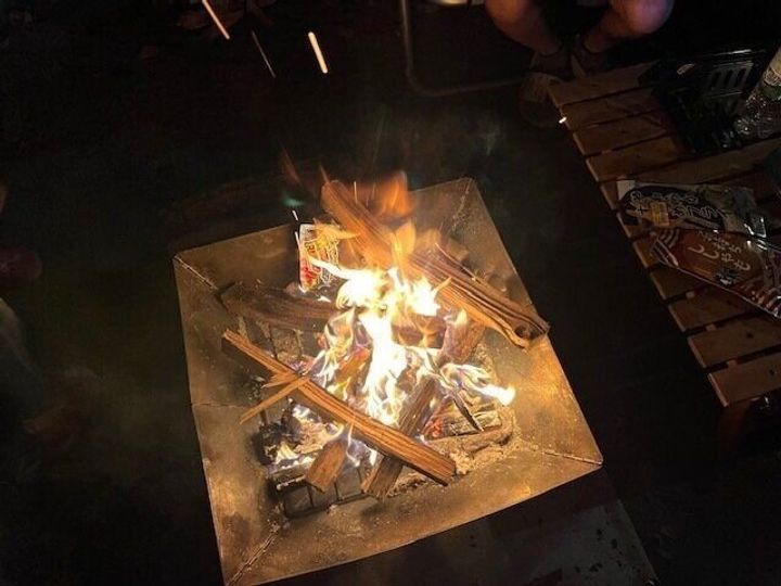 夕飯のバーベキューのあとに、暗くなったのでたき火を始めました。では、使ってみます。
