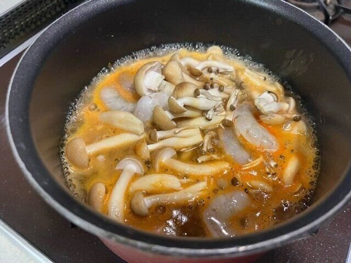 鍋にブイヤーベースの素と水を入れ、その後魚介と今回はきのこも入れてみました。