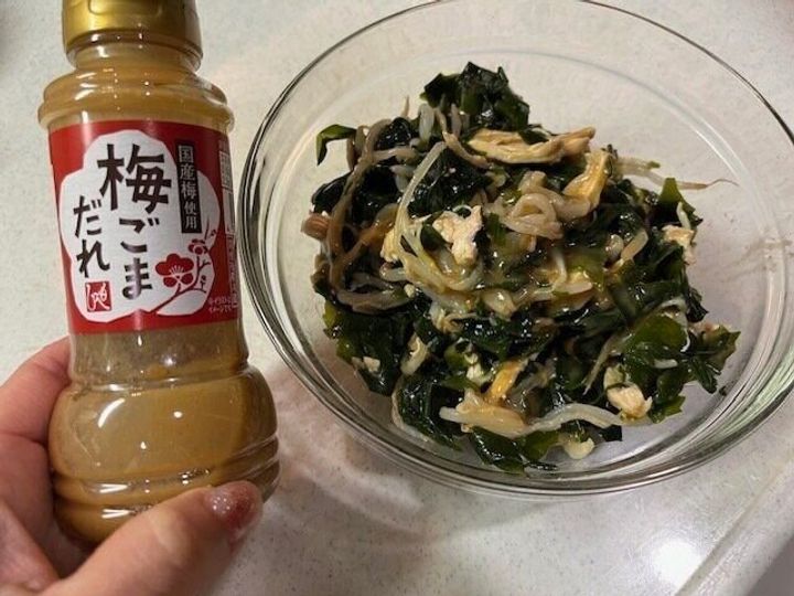 鶏胸肉、わかめ、もやしを茹でてこちらの「梅ごまだれ」で和えました。