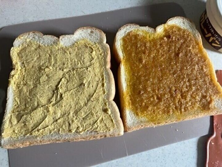 塗ったらトースターで焼きます。まずは3分くらい焼きます。比べると焼き色がつきました!