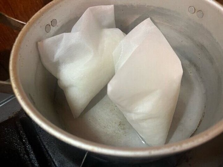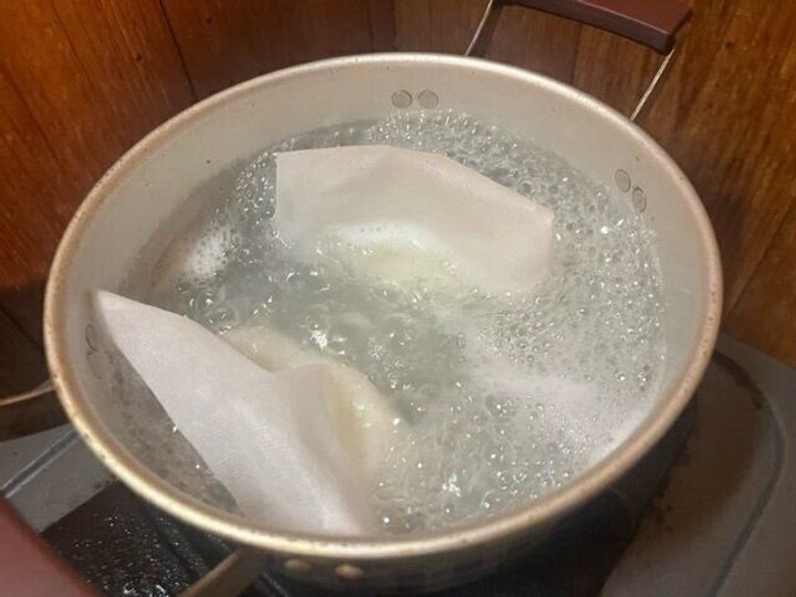 深めの鍋に水を入れ、沸騰させたらお米の袋を入れました。お米が全部つかる位が良いとおもい