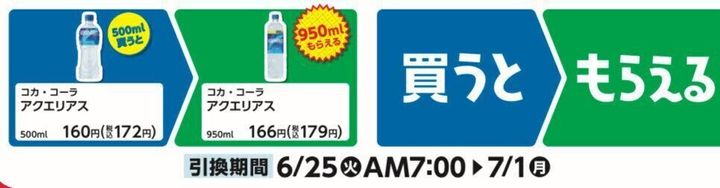 そしてもうひとつはこちらの、コカ・コーラ「アクエリアス」500㎖を購入すると、次の週に同じく「アクエリアス」に引換えられるのですが、よく見ると引換え時になんとサイズがアップしています!引き換えられるのは950㎖と、買ったときよりもサイズ、値段ともにアップしているなんておトクでしかありません!