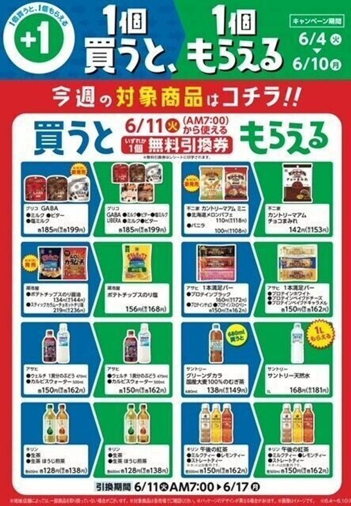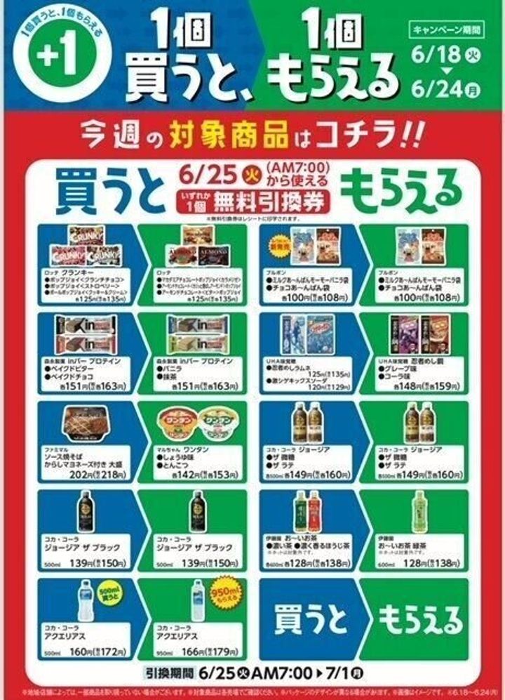 6月18日(火)から6月24日(月)までにこちらの青色で囲われた商品を購入すると、6月25日(火)7:00から7月1日(月)にレシートクーポン提示で緑色に囲われた商品と引換えることができる!