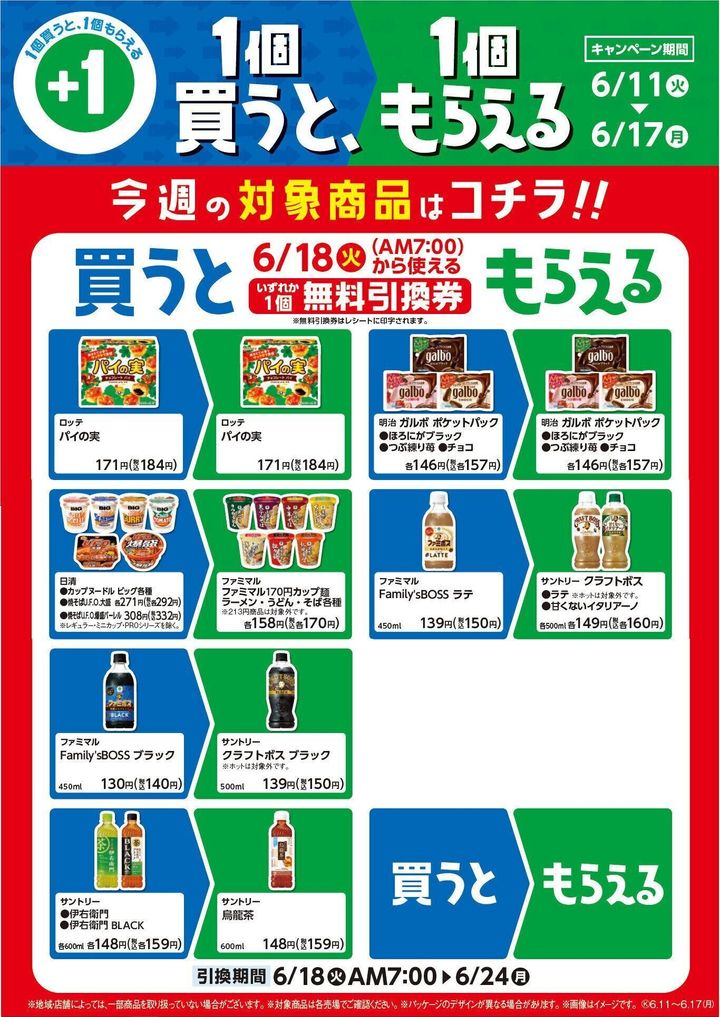 6月11日(火)から6月17日(月)までにこちらの青色で囲われた商品を購入すると、6月18日(火)7:00から6月24日(月)にレシートクーポン提示で緑色に囲われた商品と引換える事ができる!