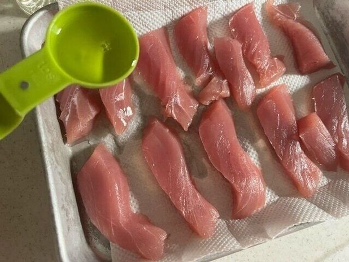 肉に「料理酒」大さじ1振りかけて、その上から片栗粉を全体にかけます。