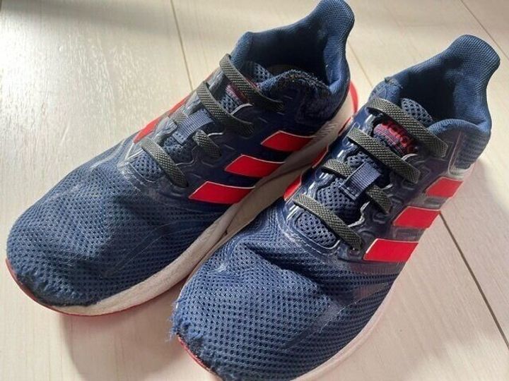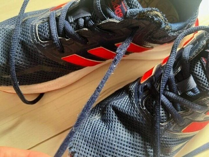 「結ばない靴紐」を使う前の運動靴がこちらです。実は紐がもうボロボロでしかも長さも長かったので