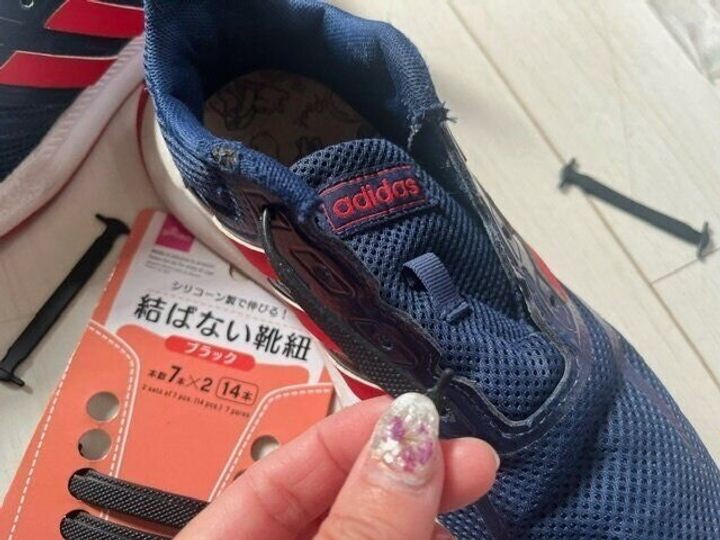 結んでも踏んづけてしまったり、すぐにほどけてしまっていたそうなので今回この「結ばない靴紐」に替えて