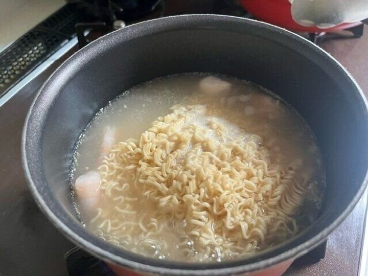 湯を沸騰させ、その中に乾麺を入れて3分ほど茹でます。こちら具が一切入っていないので今回は