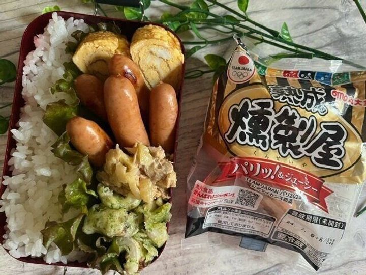 焼き上がったウインナーをお弁当に詰めました。さけることなくでも、表面のパリッと感が伝わってきます。