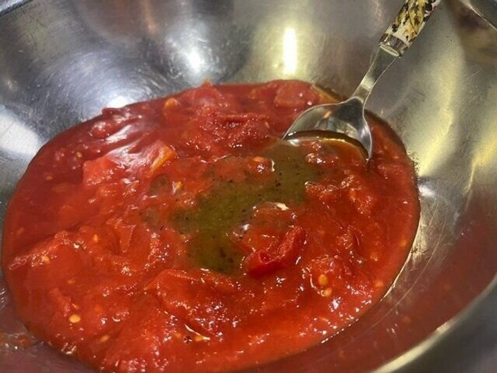これをダイストマト缶合わせます。これで完成。よく混ぜて冷蔵庫で冷やしておきます。