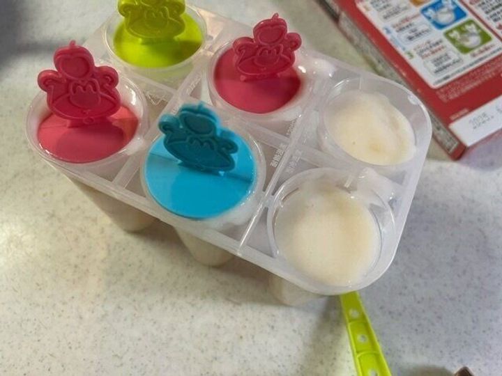 できあがったフルーツアイスの素はアイスメーカーに流し入れ冷凍庫で固めます。