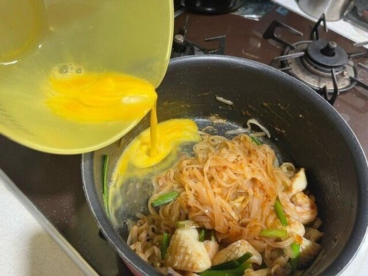 そしてここでパッタイソースを加えます。つぶつぶした感じで真っ赤なのでとても辛そうです。