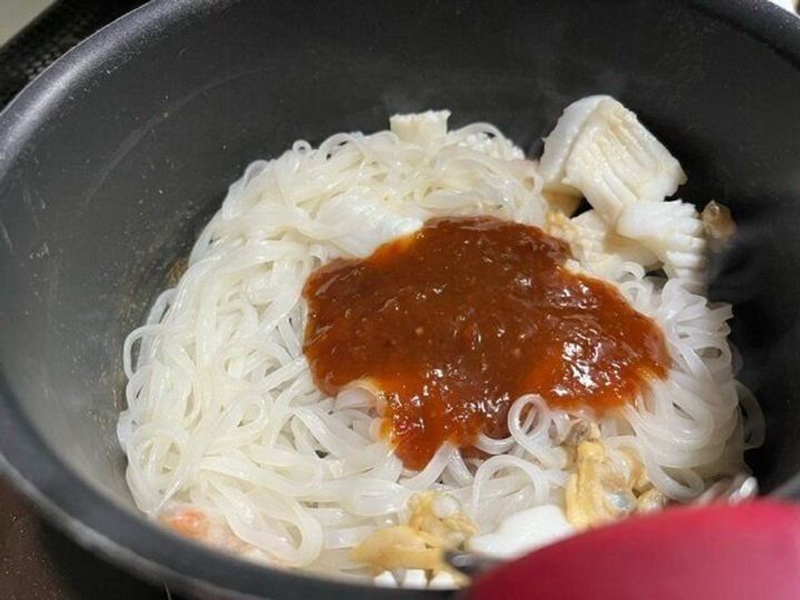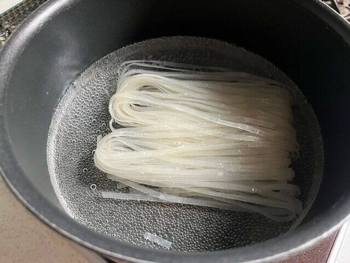 米麺はまず、熱湯で1分ほど茹でておきます。このときゆで汁を大さじ2ほどとっておきます。