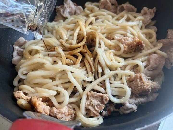 袋の中にはめんとソースが入っています。めんはもちもち食感の焼うどん用にアレンジした讃岐生うどん。