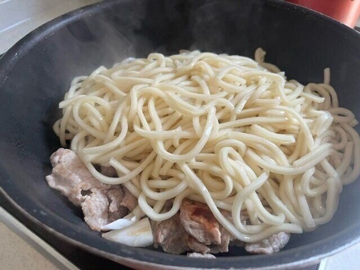 めんが茹で上がる直前に具材をフライパンで焼きます。