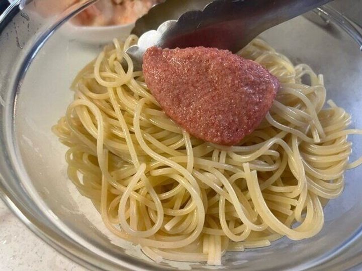 茹でた麺にも混ぜてみました。麺が熱いうちにたらこスプレッドと混ぜ合わせます。