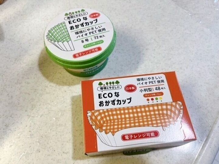 こちらです。「環境に優しいECOなおかずカップ」8号72枚入り、小判型48枚入り