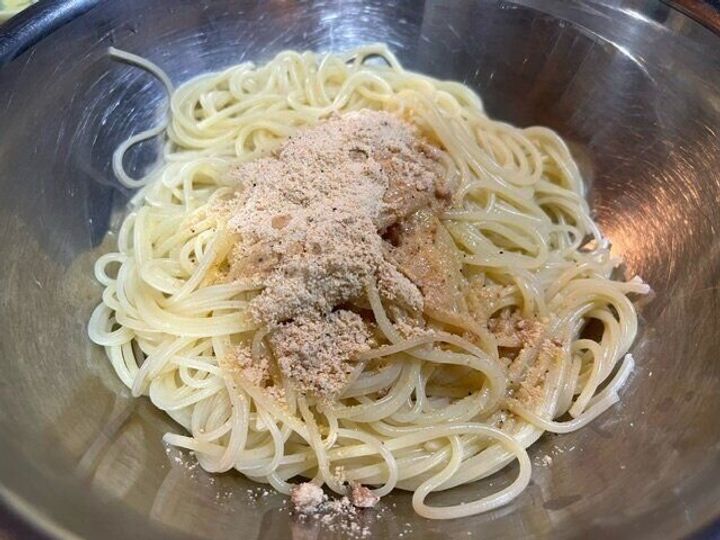 よく混ぜてみました。粉が結構固まりやすいので茹でたパスタに少しだけゆで汁を加えました。