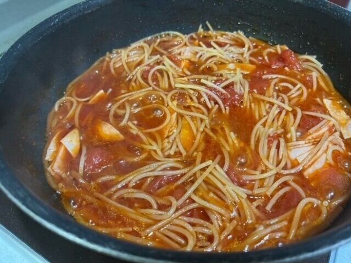 全体を軽く混ぜ、パスタを平らに広げたらあとは汁気がなくなるまで煮込むだけ。