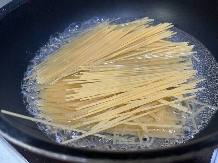 フライパンにお湯を沸かして、そこへパスタを入れて茹でます。