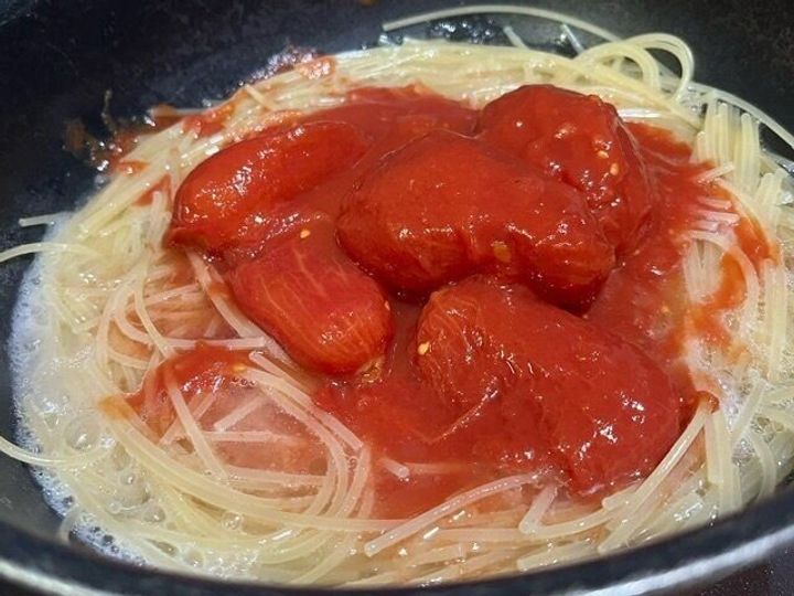 パスタを5分ほど茹でたら、ここにオリーブオイル、トマト缶そしてパスタソースの素を加えます。