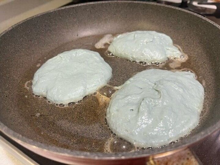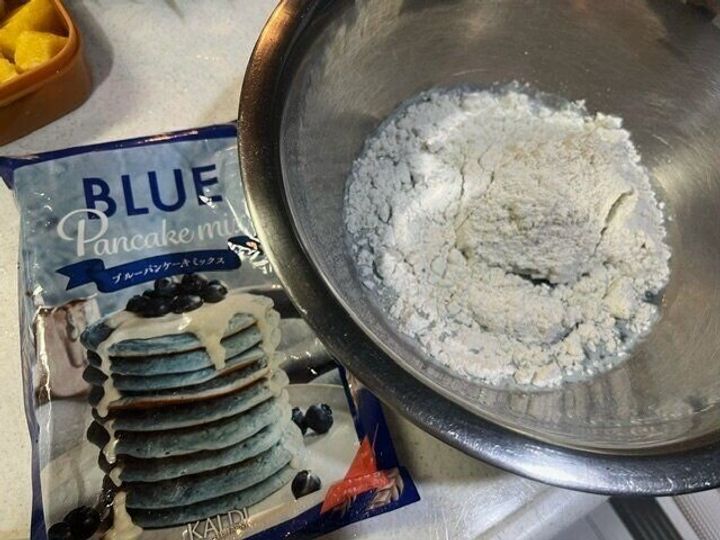 水と混ぜるだけなのに、ブルーのパンケーキが焼ける!