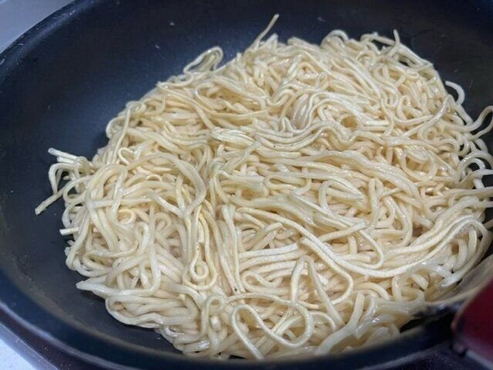 湯切りした麺を油を引いたフライパンに入れ、こんがりと焼き色が付くまで焼きます。