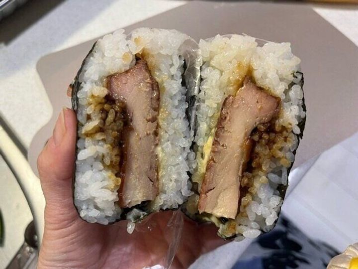 ごはんの量もものすごく多いけど、おむすびの中にこの厚さの肉が入るとは。