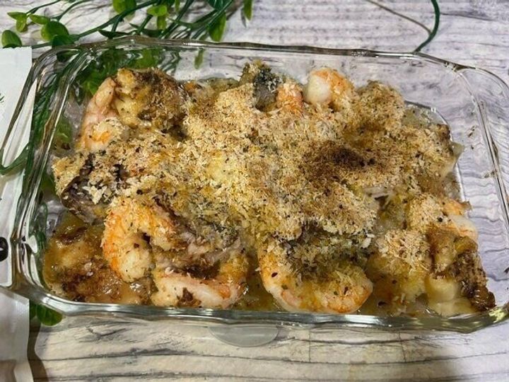 えびを耐熱容器にいれ、そこに軽く水気を切ったサバ缶をいれます。あとは上から香草チーズパン粉を