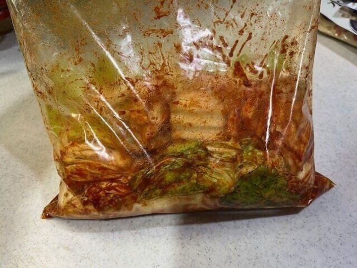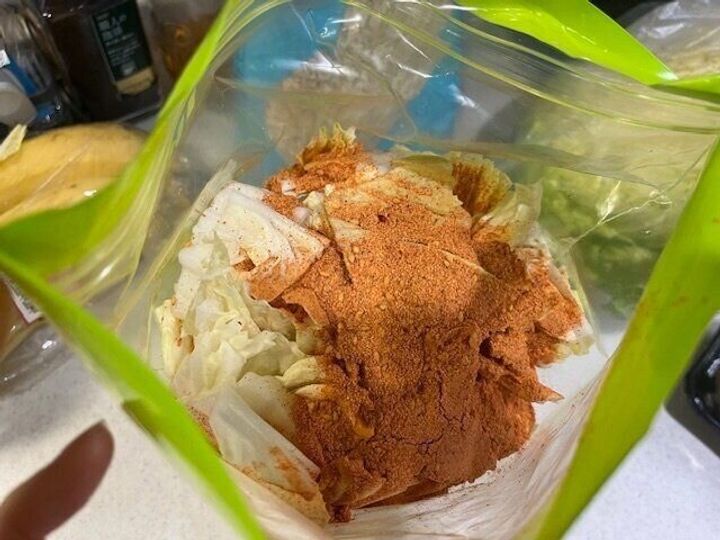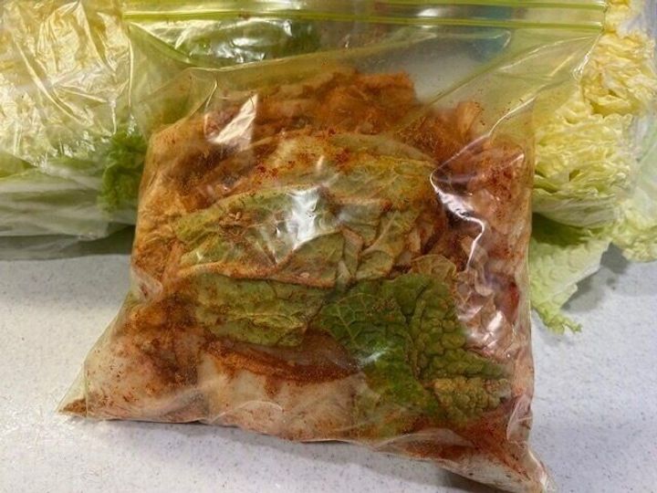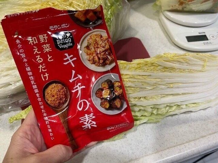 作り方は本当に簡単。白菜を好きな大きさにカットしたら、保存袋などに入れその上にこの「キムチの素」をいれるだけ。