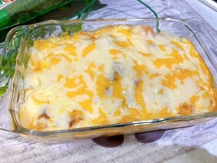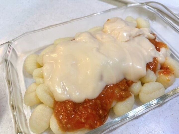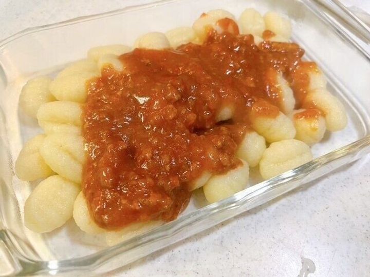 ニョッキを耐熱容器にいれ、その上にミートソースをかけます。