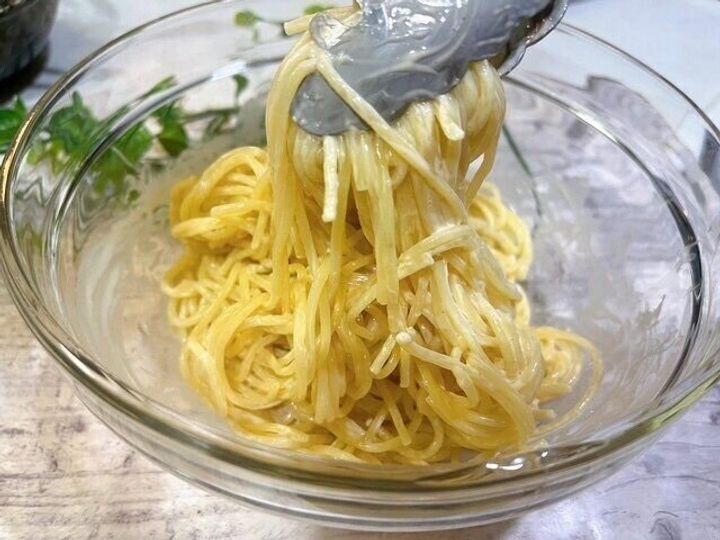 麺は標準通りに茹でました。茹で上がった麺にこのソースを絡めます。