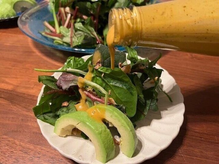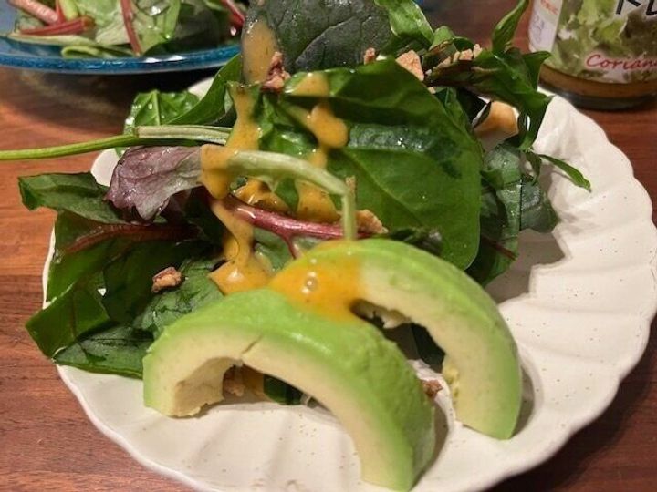 サラダにかけてみました。どんなサラダにも合うと思うのですが、今回はサラダほうれん草とアボカドのサラダにかけてみました。