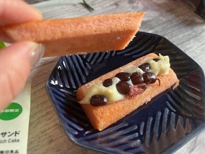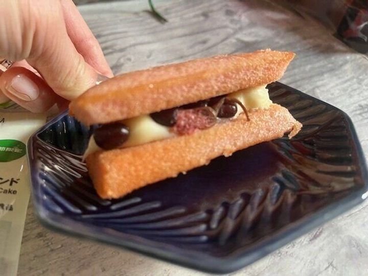 色がピンク色なのも珍しいのですが、サンドしてある感じも珍しい。そして真ん中になんとあずきが入っています。これはとてもおいしそう。早速たべてみました。
