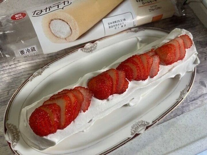 さらに、この時期なのでいちごを飾ってみました!すると一気に豪華に。おもてなしのテーブルにもピッタリのロールケーキが完成しました!