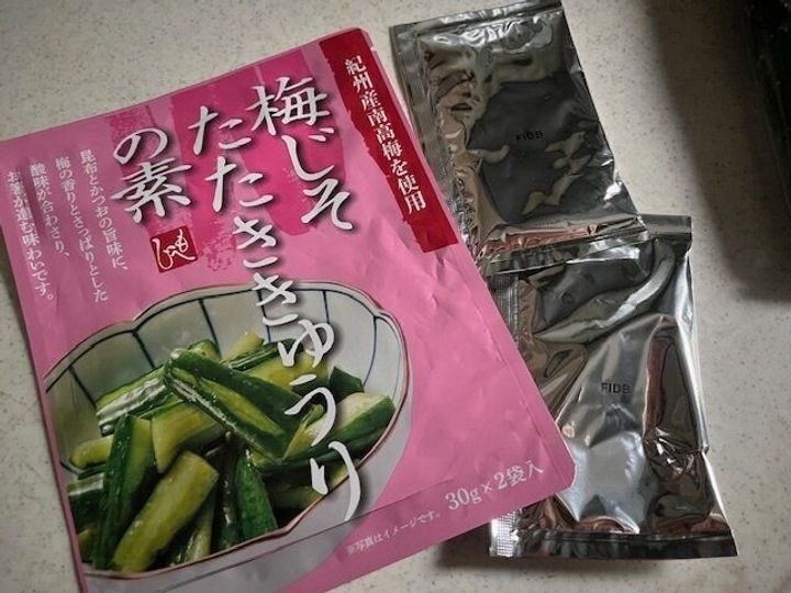 こちらです。「梅じそたたききゅうりの素」30g×2袋 228円(税込み)