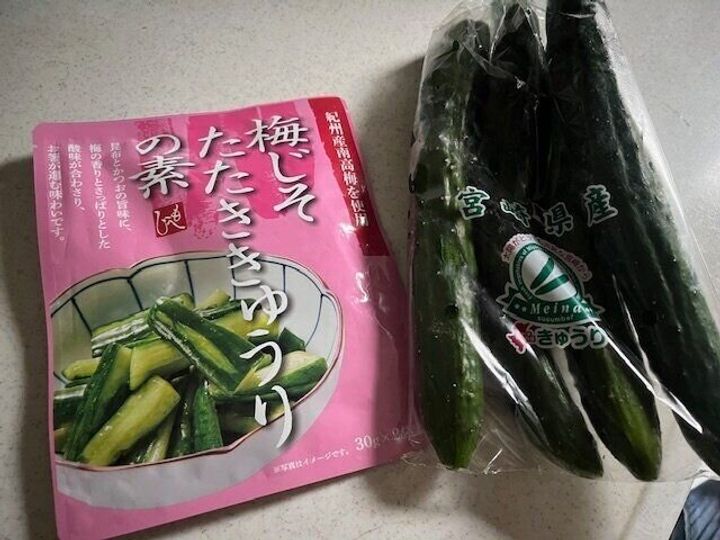 これだけ。「梅じそたたききゅうりの素」は少しどろっととろみがついていて、袋を開けた瞬間に梅の良い香り。