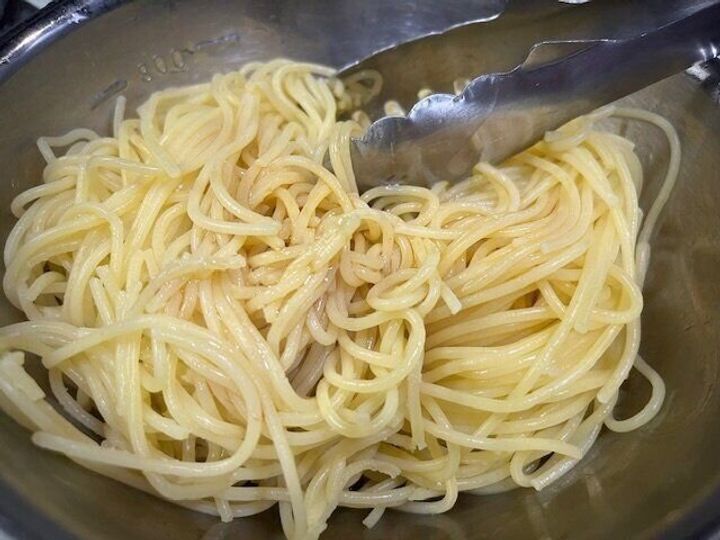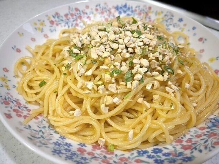 パスタはいつも通りに茹で、だし醤油ソースを麺に和えました。袋を開けた瞬間にだしの良い香り。