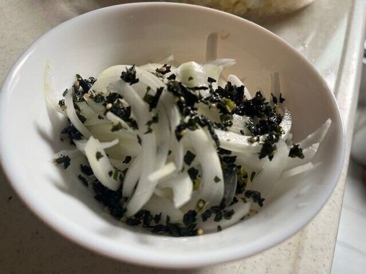 少し水につけて辛味をとった新玉ねぎにザクザクわかめをふりかけました。