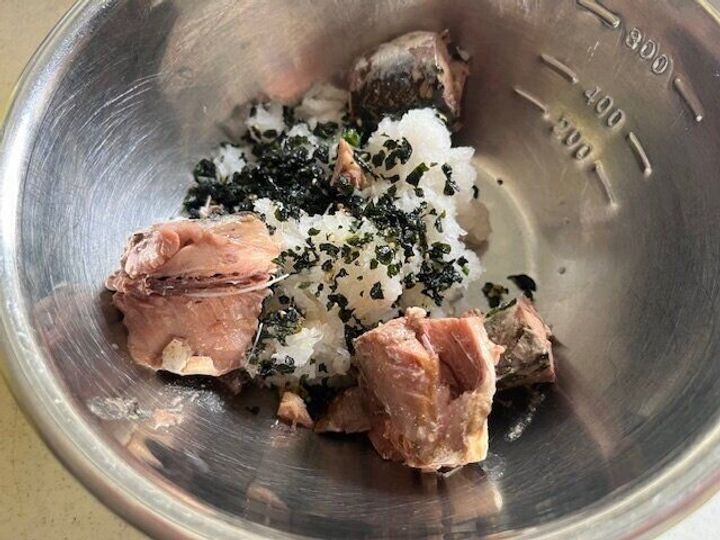 さらに、サバの水煮缶を入れました!サバの水煮缶は水分を切ってからいれます。