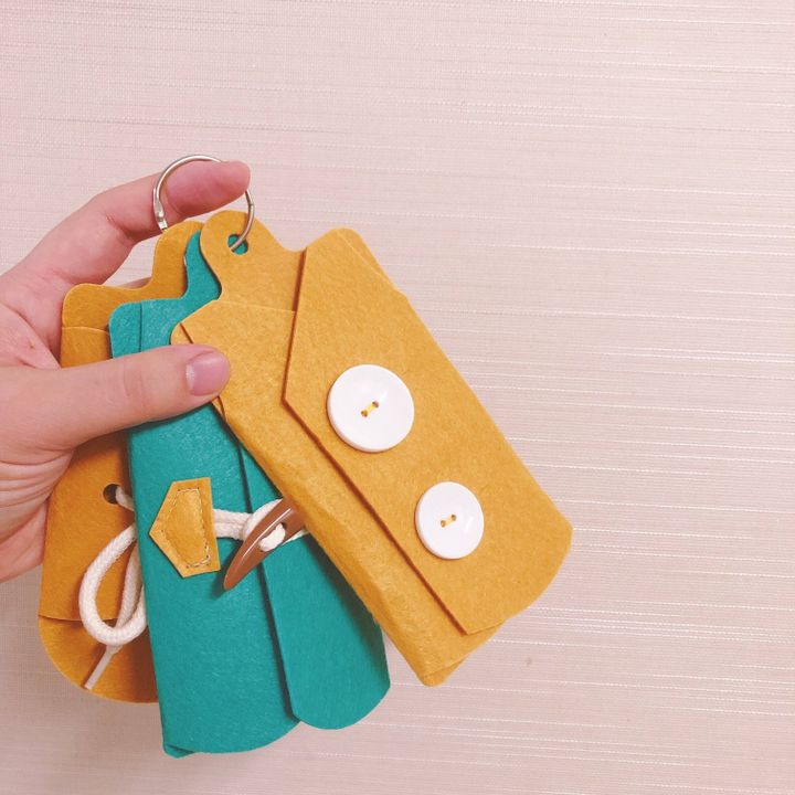 フェルトが硬いのか、ボタン穴が小さいのか...少々手こずっていました^^;
