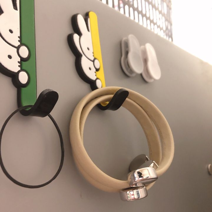 私は冷蔵庫にくっつけているミッフィーのマグネットフックに引っ掛けています。