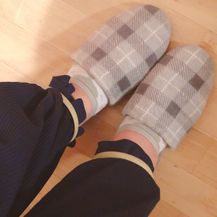 ワイドパンツを履いているとき、トイレで下ろすと床についちゃいますよね。そんなときにこのアームバンドで裾を留めると…
