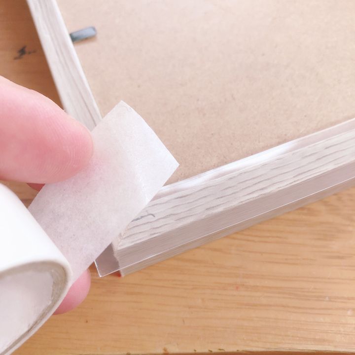 フォトフレームの上下にアクリルフォーム両面テープを貼って、壁紙を傷付けないようマスキングテープも貼っていきます。アクリルフォーム両面テープもマスキングテープもダイソーで購入しました。←アクリルフォーム両面テープは重たいものだと落ちてしまうこともあるのですが、フォトフレームのように軽いものであればしっかり固定できます。