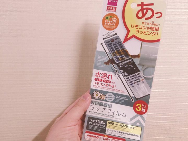 今回商品させていただくのは、ダイソーで見つけた【リモコン用ラップフィルム】。ドライヤーで温風を当てることで簡単にラッピングできて、リモコンを水濡れや汚れ、埃などからガードしてくれる商品です。
