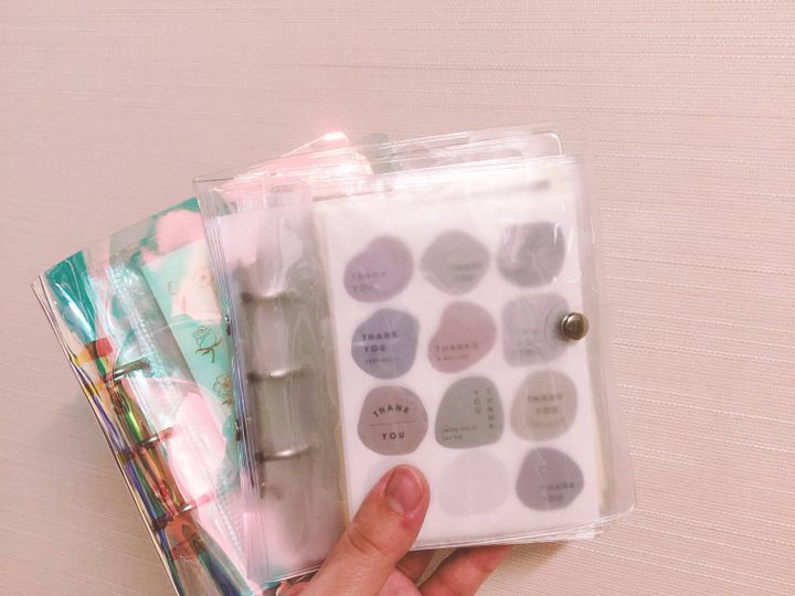 今回買ったバインダーはクリアとオーロラですが、私はクリアにはフリマアプリの発送時に使えるシールやお名前シールを入れて、オーロラには手帳や手紙用のシールを入れています。