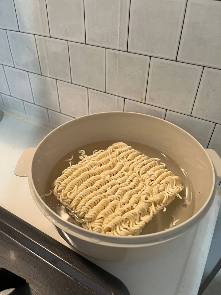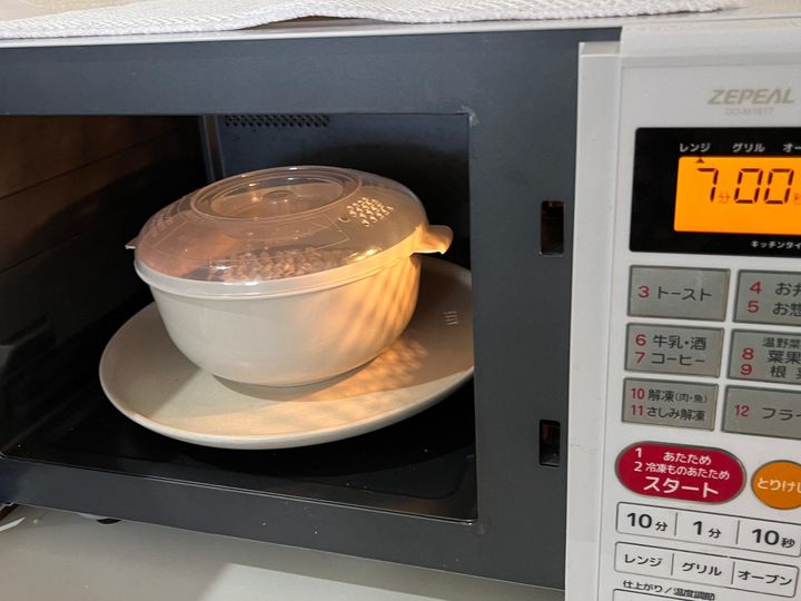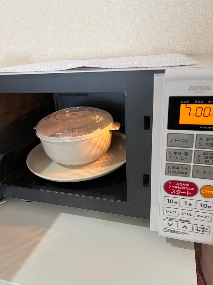 ③蓋をして水の場合7分、湯の場合3分500wのレンジで温めます。野菜入りの場合、上記にプラス1分になります。※目安です