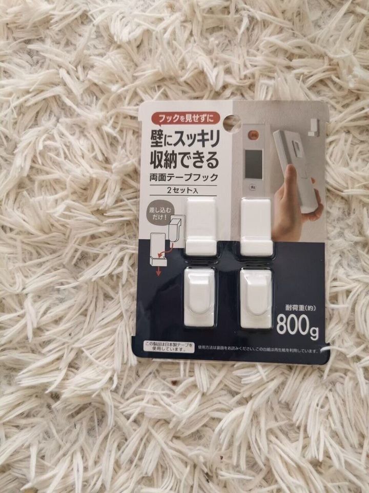 そこで体温計に、セリアの壁にスッキリ収納出来る両面テープ付きのフックを貼り付けました。